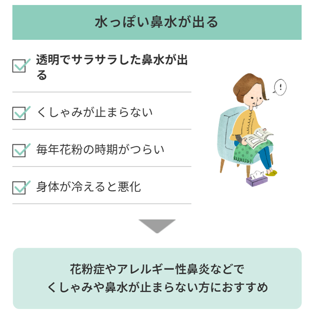 鼻水やくしゃみ、鼻炎などの症状は、冷えなどにより体内に余分な水分が溜まることで起こると漢方では考えられています。