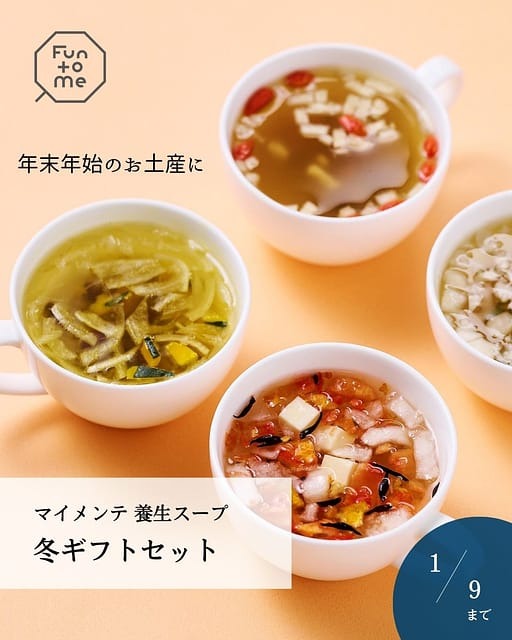 カップに入れたらお湯を注ぐだけ。様々な和漢素材をブレンドしたスープとお茶をお召し上がりください。